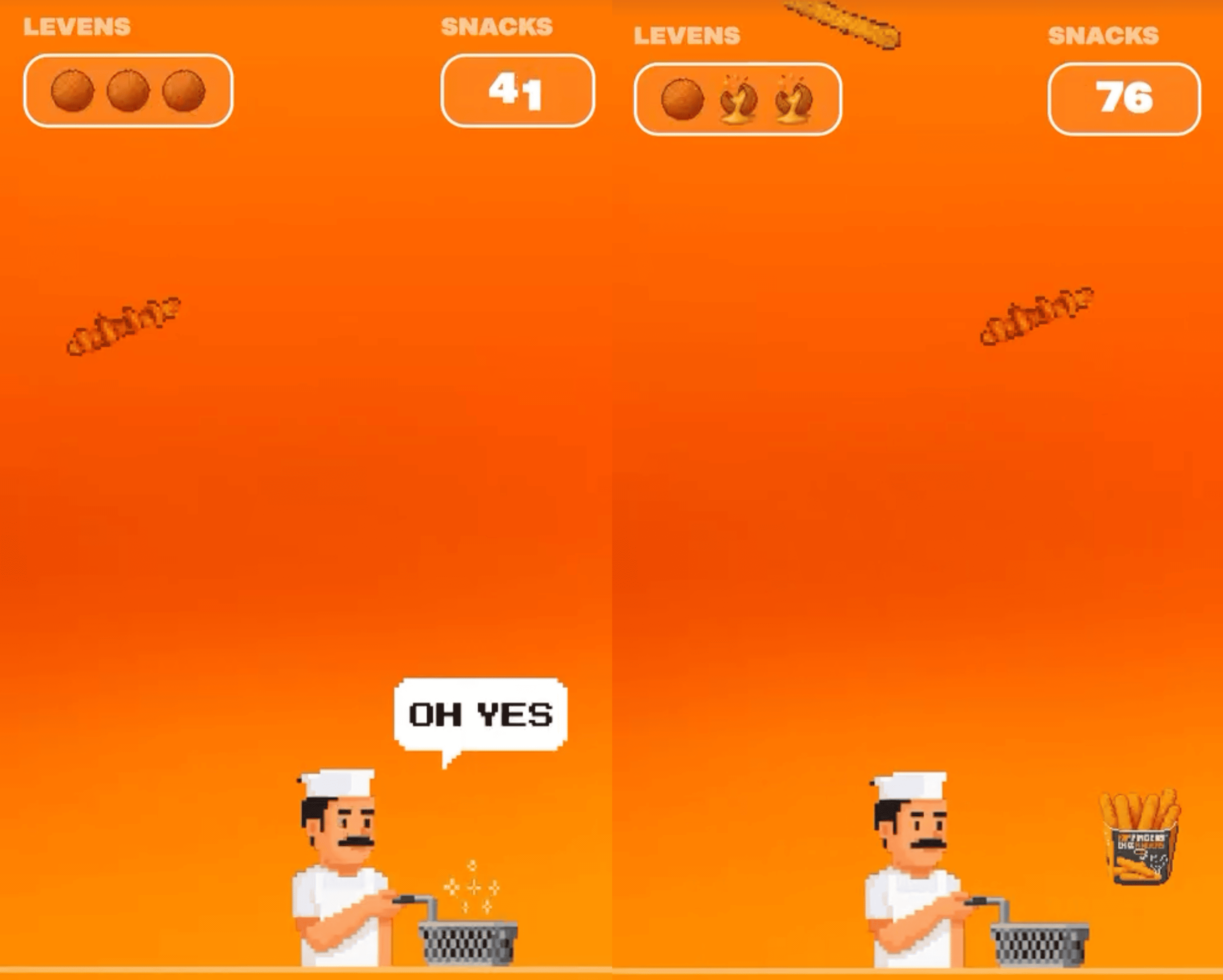 The game itself is deliberately straightforward. We designed a lightweight arcade experience where you play as a friturist, catching as many falling snacks as possible with your fryer basket. Let three snacks slip through, and it’s game over. Perfectly bite-sized. Perfect to play while waiting for your order.